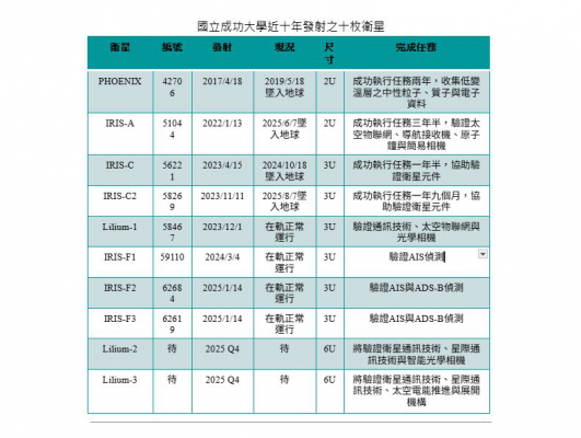 成功大學自2017年以來,已陸續研製、發射並操作多枚立方衛星,均成功完成任務。隨著台灣百合二號與三號即將發射,成大將達成「十年十顆衛星」的重要里程碑,展現長期致力於太空科研與教育之成果。