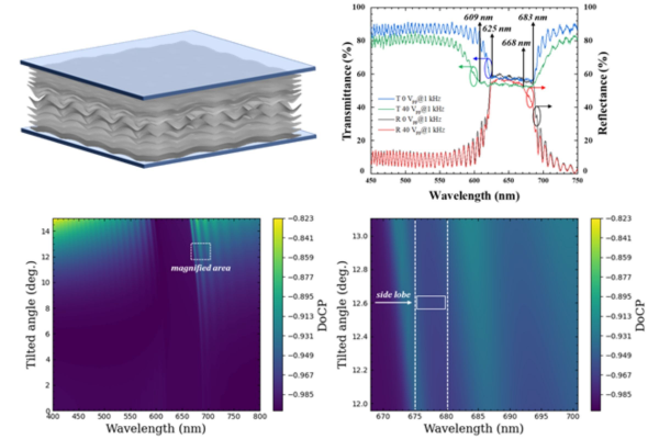液晶光電領域除具備實際於顯示器及智慧窗等應用外,更因其對電場與熱等外界刺激可產生對應反應,故在光學元件與感測領域中另具有獨特價值。膽固醇液晶具備可生成布拉格反射效應之螺旋週期結構,在實際應用面上可用於製作反射式顯示器,且由於膽固醇液晶本身所具備的雙穩態特性,使得此類反射式顯示器不僅在顯示靜態影像時無須耗能,其產生之布拉格反射效應也使得該裝置在戶外使用下仍可維持高影像對比度。德國物理學家W. Helfrich曾發現對膽固醇液晶施加強電場會形成二維週期形變,稱為Helfrich deformation,而過往研究多著重於如何以此結構切換影像顯示色彩或研發各式穩定該形變結構的方法。