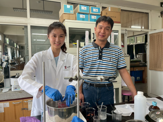 孻自馬來西亞的蔡佩軒在嘉藥助理教授梁峰賓實驗室,親手製作紫雲膏、紫雲凝膠和防蚊凝膠。照:嘉南藥理大學提供