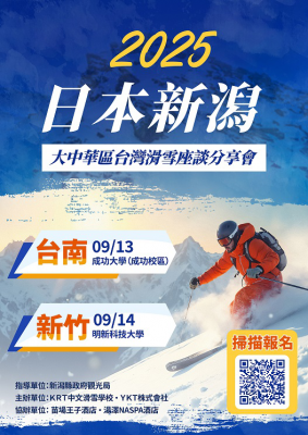今年YKT再度攜手新潟官方合作滑雪座談會,首度將活動帶到新竹舉辦,9/14(日)下午在明新科技大學登場,以「科技的城市,雪地的速度」為主題,寓意在創新氛圍濃厚的新竹,開啟一場跨界的冰雪冒險。座談會有新潟縣府官方代表親臨介紹雪場特色,也邀請KRT滑雪學校代表分享滑雪運動的樂趣與入門秘訣。分享會更邀請台灣知名滑雪旅遊作家娜塔蝦分享粉雪秘境、溫泉物語與雪場文化,並設有現場抽獎,提供專屬滑雪好禮。座談會全程免費入場,但名額有限,需事先完成線上報名,報名網址: https://forms.gle/JMaXRkNgKP2enVd87 。