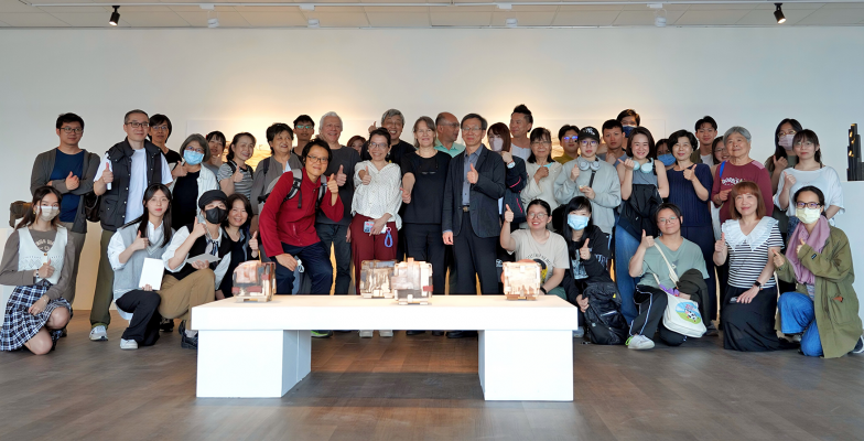 華梵大學駐校藝術家在雕塑作品前與參觀展覽的師生大合影。照:華梵大學提供