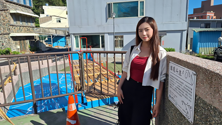 許馨方同學與其設計的海洋意象背景〈旗乘斗浪〉。照:國立臺灣海洋大學提供