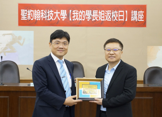 朱復銓董事長(右)非常願意提供自己的資源投資及培養學弟妹。左為艾和昌前校長。照:聖約翰科技大學提供