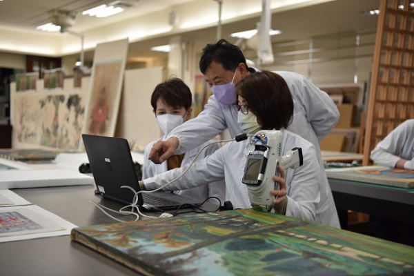 跟著文保中心主任張元鳳走進修護室內部,修復師與研究生在確保文物安全無損的前提下,正仔細地去除令作品上斑駁黯淡的髒污、灰塵。同時,在美術系教授林震煌的指導下,另一群人以拉曼光譜儀進行非破壞檢測,科學檢測對於講究安全、可逆、可辨識性修復原則的文保作業來說,是不可或缺的重要關鍵研究。
