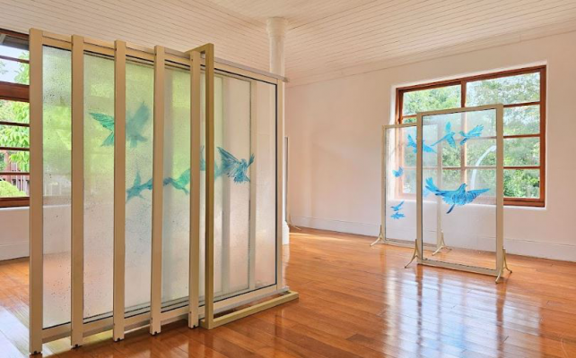 此外,南嶼詩社展現春天的〈複色光〉,由多彩圓片與藤蔓構成,蝴蝶在牆面與光影間穿梭,形成柔和明朗的春日印象;〈光閘〉懸掛著綠色壓克力方塊與藍染布,彷彿夏日的明亮閃光,青翠的植物則是躍動的生命在狂放;〈菲林〉以落葉與手寫詩句記錄秋天的私語;〈失焦〉利用原有的空間屬性,以霧面塑膠與棉絮等媒材,來模擬不斷漫出浴缸的水珠或泡沬,再現冬日時常蔓延而出的蕭寂情緒。《縮時顯影》展覽不僅讓觀眾「看見詩」,更能「走進詩」,感受時間、情緒與自然的交織及共鳴。