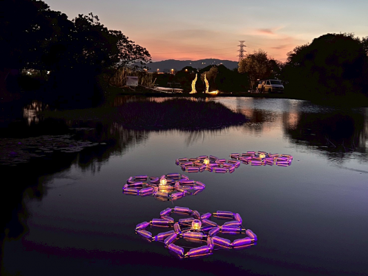 黃琬雯表示,作品靈感來自濕地常見的被子植物五瓣花與水生植物維管束切面,呈現自然中的幾何秩序之美。團隊以回收寶特瓶構築漂浮結構,並以螢光骨架連結出五邊形與十邊形的分形形式。白天,作品化為漂浮於水面的寶特瓶地景;夜晚,僅見閃爍微光的幾何花瓣在水面上綻放,象徵人工與自然的交融與共生。她指出,寶特瓶象徵城市消費循環,植物幾何代表自然生態的循環,兩者對立卻相互映照。這正是人與自然共存的縮影。