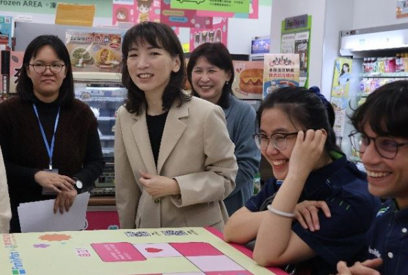 賽珍珠基金會婦幼公益大使尹崇恩甫從德國策展返國,以自身國際經驗勉勵學生體會「世界一家」的意義。她指出,同學們在全家便利商店體驗中蒐集各國特色零食,正呼應「全家就是我家」的企業精神。這種兼具國際視野與本土關懷的價值,是當代企業文化中不可或缺的重要特質。看到來自不同國家的學生以華語進行結帳、製作咖啡、接待顧客的互動過程,並保持親切笑容,讓人深感欣慰,這份熱情正是文化交流最真摯的回饋。