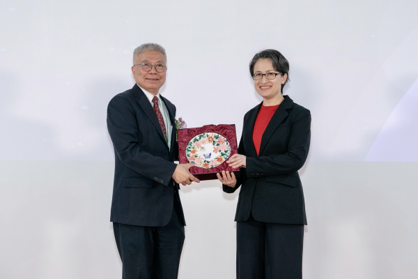 北科大校長王錫福(左)致贈陶瓷彩繪盤予副總統蕭美琴。照:北科大提供