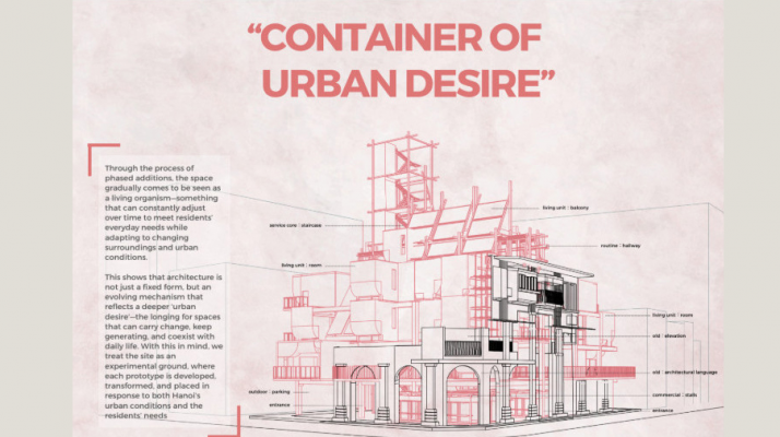 作品〈都市慾望容器 Container of Urban Desire〉由蔡丁毅指導,以老屋改造為題,觀察到當地房屋常透過加蓋與樓梯延伸不斷生長,呈現建築的動態特質。成員黃寶震表示,團隊據此提出如有機體般可持續變化的設計,以回應社區居民的需求與慾望,榮獲 HUCE Award。另一組作品〈聽聲坡 The Audible Slope〉由柯純融指導,針對河內午後雷陣雨造成的淹水問題,設計結合水資源循環與聲景的集合住宅方案,榮獲野村獎。