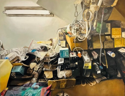 大四生賴昱丞在指導老師王紫芸的帶領下,以作品《地下室》獲得油畫類入選獎。他表示,小時候在阿公阿媽家長大,家裡有很多長輩愛物惜物保留的物件,創作時從家族記憶出發,描繪地下室中堆滿阿公阿嬤留下的舊電線、電器、紙盒與生鏽工具等雜物,呈現節儉、惜物、惜福的生活精神,希望可以引領觀者重新思考物件背後所承載的情感與記憶。