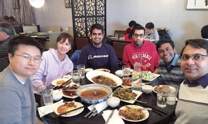 ▲ 赴美深造期間,許華倚(左2)從土木跨進機械領域,與西北大學博士班指導老師(右 1)、同學相互學習。