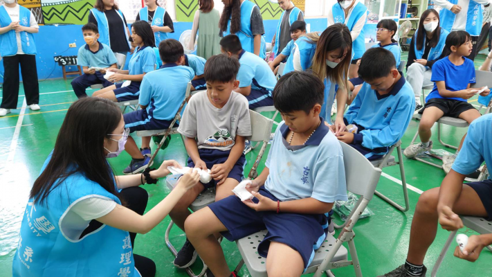 義守大學「醫學院」護理學系學生走進社區前進國小,將在校專業所學融入創意方式,引導小學生吸收正確的健康教育觀念。照:義守大學提供