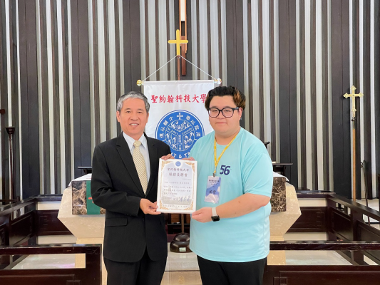 唐彥博校長(左)頒發輔導幹部聘書給服務同學,蔡尚哲同學(右)從校長手上接下服務新生的任務。照:聖約翰科大提供