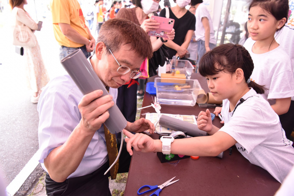 南湖國小設計「音浪太強-雷聲筒製作」攤位,小朋友當關主帶著貴賓動手做,透過一根細長彈簧在圓筒產生共振原理,就會產生巨大雷聲,輕鬆了解聲音的奧秘與原理;仁愛國中「抖抖機械獸來畫圖」讓親子利用簡單零件自製震動馬達,搭配具有彈性的鐵絲腳,使機械獸抖動前進;西松國小「一起來電」關卡,小朋友使用靜電棒讓鋁箔紙維持在空中十秒以上,玩得很開心;臺師大物理系大學生也帶著小朋友製作簡易飛機,認識飛行原理及白努利定律;東山高中「刻在DNA裡的大砲魂」由高中生帶著小朋友認識簡易的電磁砲原理。