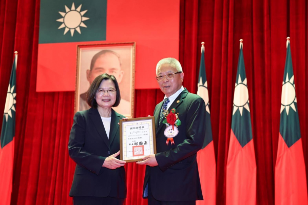 112年軍人節暨國防教育日活動中,蘇慶福董事長(右)榮獲蔡英文總統頒發「敬軍楷。照:醒吾科大提供
