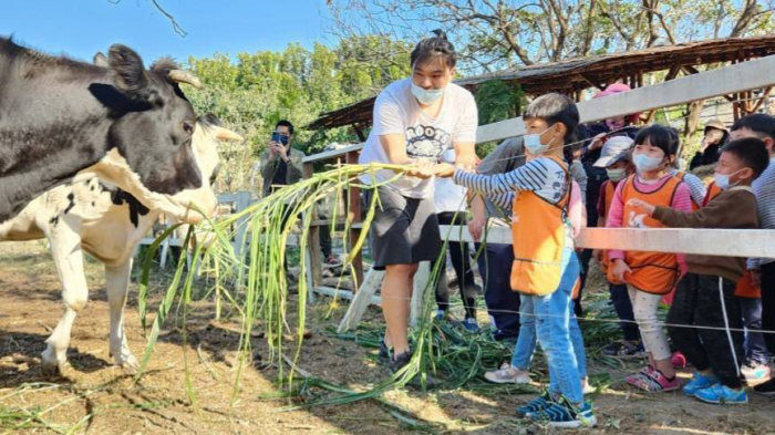 小小農夫親餵學校飼養的乳牛。照:明道大學提供