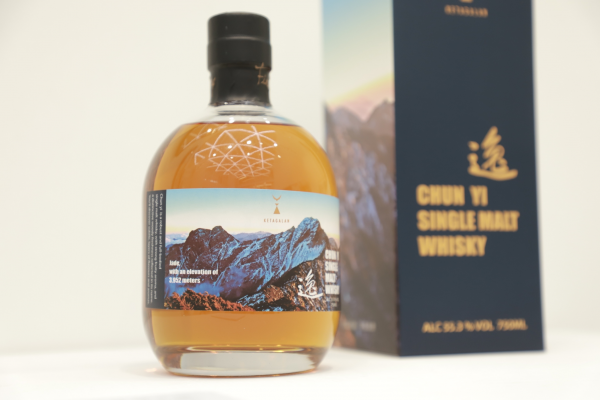「玉山瑞雪」是游登良在轉調海洋國家公園前夕,於元宵節登上玉山從北峰回拍主峰的系列作品之一,本月29日的開幕茶會現場轉贈高科大典藏。策展人游明龍也選了同一件作品結合書藝家林章湖的墨寶,為凱達格蘭酒業有限公司設計做為「醇逸–單一麥芽威士忌」的酒標。該款酒獲得今(2023)年美國舊金山世界烈酒競賽金獎。照:高雄科技大學提供