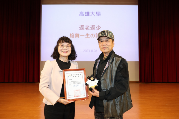 國立高雄大學「卓越講座」,28日邀請國際藝術大師、「伯夷山莊」莊主許伯夷,以「返老返少 焰舞一生の許伯夷」為題,分享集醫療、旅遊、藝術創作與慈善於一身,「奇人不凡」人生。校長陳月端特別致頒感謝狀,引領學子感受與學習尊重多元文化。