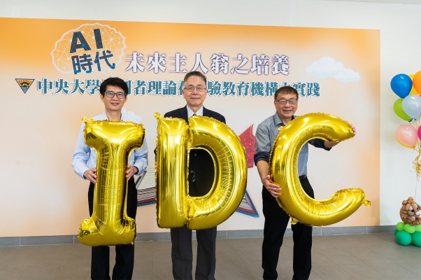 中央大學陳德懷國家講座教授(右)提出的興趣驅動創造者(IDC)理論,成功落實在「桃園市趣創者國際實驗教育機構」,培養新一代未來主人翁。左桃園市教育局蔡聖賢主秘、中為中央大學周景揚校長。照:中央大學提供