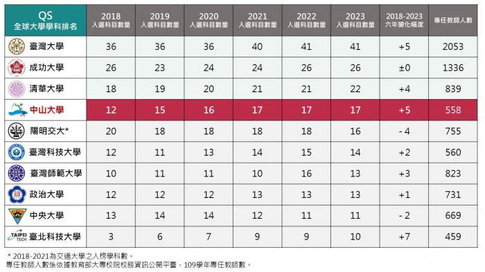 英國高等教育調查機構(Quacquarelli Symonds,簡稱QS)公布最新2023世界大學學科排名,國立中山大學與台灣大、成功大學及清華大學名列全國前四強。本次中山大學共有17個學科入榜,其中石化工程蟬聯全球百大,更是全國唯一入榜。